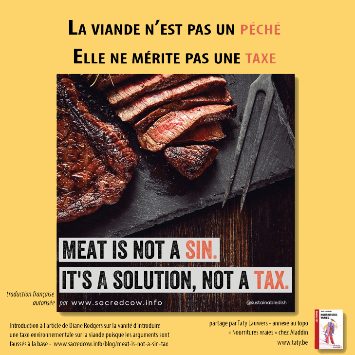 Je continue sur ma lancée: réfléchissons un peu les slogans simplistes qui nous sont balancés tous les jours sur les réseaux sociaux. En anglais, une taxe environnementale se dit "taxe de péché". Certains pays européens proposent de taxer la viande, mais elle n’est pas un péché! Elle ne mérite pas une taxe, vu que les arguments sont faussés à la base. Les animaux élevés en pâture raisonnée seraient même partie de la solution pour protéger la planète. Voilà ce qu'explique l’article de Diane Rodgers sur la vanité d’introduire une taxe environnementale: Meat is not a sin tax. Traduction ici, sous peu.