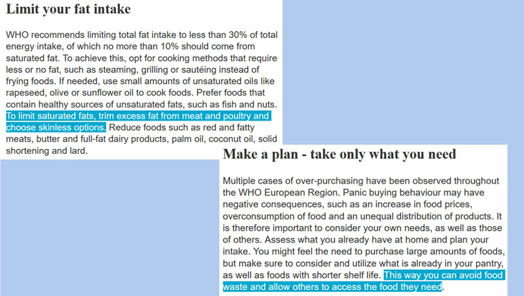 30.3 Lire les conseils si peu avisés de l'OMS pour la cuisine en temps de crise/corona, ce mois de mars 2020: "cuisinez" -> bravo, merci les gars. Mais: "jetez le gras de la viande et la peau du poulet pour éviter les graisses saturées", voilà qui fait bizarre. Non seulement ce sont des concepts des années '70, totalement obsolètes, mais la peau du poulet n'est-elle pas riche en mono et polyinsaturées? En outre: "ne gaspillez pas la nourriture". Quelle incohérence! Ils viennent d'écrire qu'il faut jeter le meilleur... Le gras c'est la vie!"