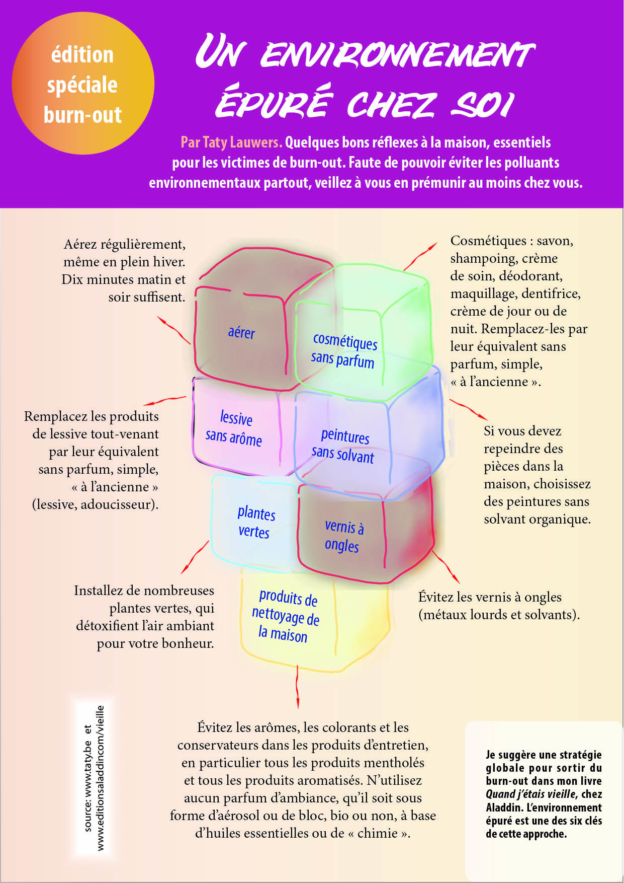 Quelques bons réflexes à la maison, essentiels pour les victimes de burn-out et les canaris de la modernité. Faute de pouvoir éviter les polluants environnementaux partout, veillez à vous prémunir au moins chez vous des contaminants ci-dessus.