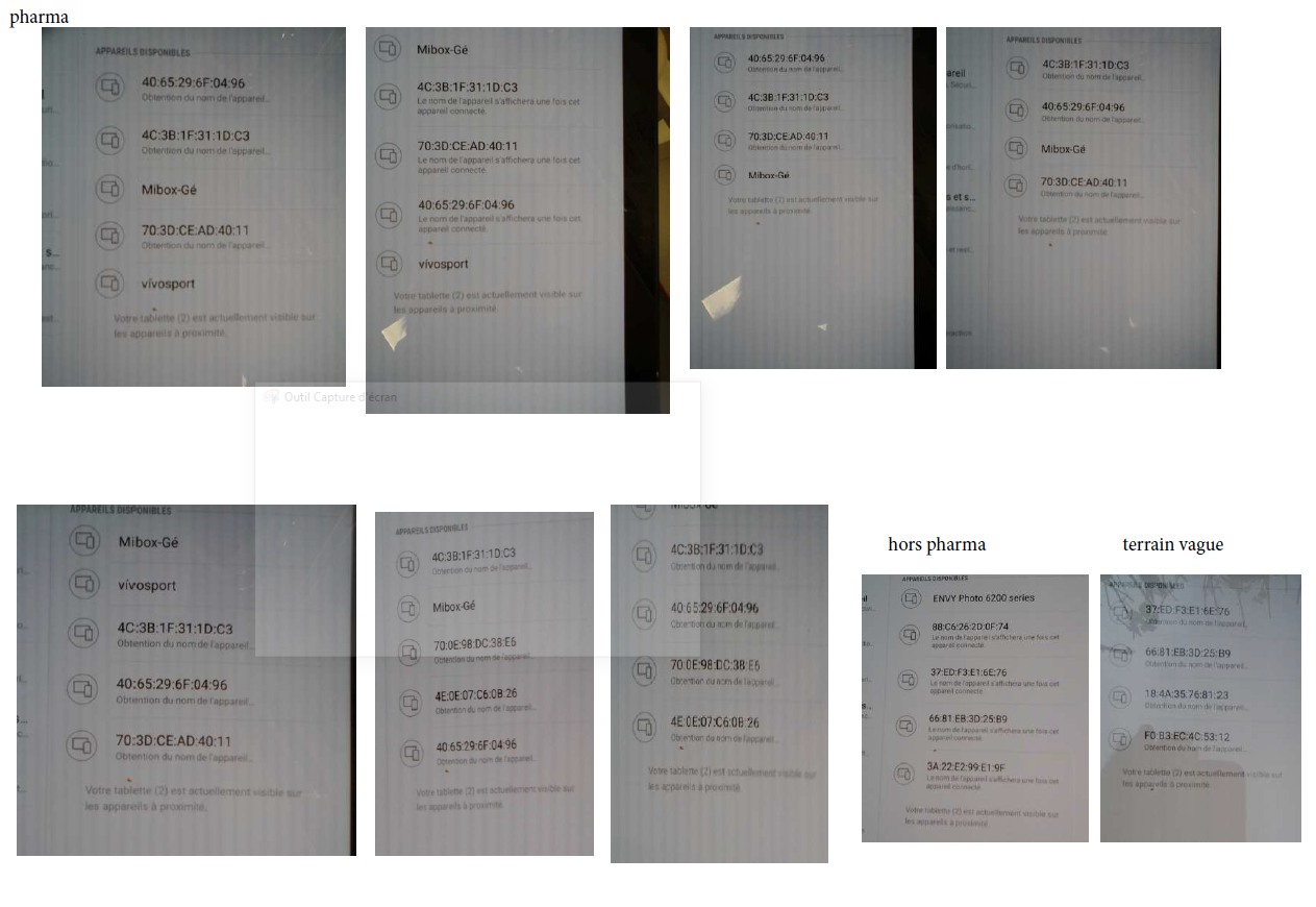 Idem pharmacie: le BT repère des noms d'appareils, logique. Et des adresses MAC fixes, pendant 10 minutes, avec à peu près 6 relances de recherche (je connais pas la technologie BT, mais je préfère éviter d'éventuels caches). Les mêmes adresses, inchangées.