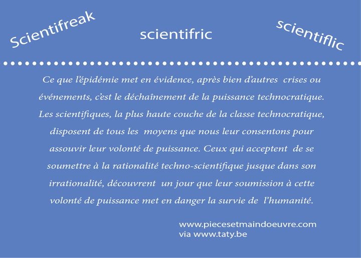 En texte: «Scientifreak, scientifric, scientiflic. Ce que l’ép..d.. e met en évidence, après bien d’autres crises ou événements, c’est le déchaînement de la puissance technocratique. Les scientifiques, la plus haute couche de la classe technocratique, disposent de tous les moyens que nous leur consentons pour assouvir leur volonté de puissance. Ceux qui acceptent de se soumettre à la rationalité techno-scientifique jusque dans son irrationalité, découvrent un jour que leur soumission à cette volonté de puissance met en danger la survie de l’humanité.