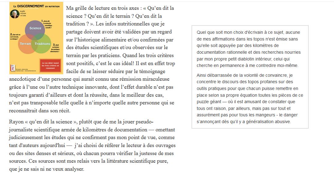 Bien, bien, chère amie, mais que faire? Eh bien revoir ses critères de discernement, tiens. Je propose les miens ici, ce sont ceux que j’ai élaborés pour définir ma posture en nutri. Je cumule la recherche scientifique avec l’observation sur le terrain et le recul des traditions alimentaires. Cette grille de lecture donne des résultats pragmatiques sur le terrain efficaces et durables. Et je m’en félicite, ainsi que quantité de mes lecteurs, merci à eux.