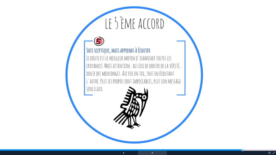 En altermonde, nous pouvons nous baser sur les accords toltèques, partagés par tant d'entre nous. Je viens d'en découvrir un cinquième ici, en présentation prezi. Je le reprends en illu: "Sois sceptique, mais apprends à écouter. Le doute est le meilleur moyen d'examiner toutes les croyances. mais attention:: au lieu de douter de la vérité, doute des mensonges. Aie foie en toi, tout en écoutant l'autre. Plus ses propos sont impeccables, plus son message sera clair. "