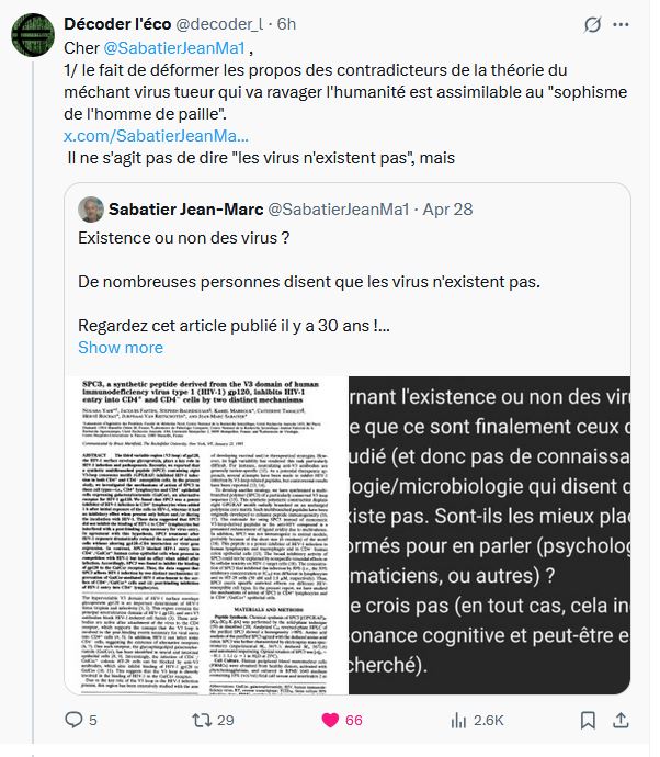 Noter que Sabatier, maître en mauvaise foi, ou sourd, va-t-en savoir, prétend comme tant de ses confrères que nous disons que"le virus n'existe pas". Faux! On prétend qu'on n'a jamais isolé un virus, mais qu'on a reconstitué une image virtuelle; qu'on n'a jamais pu rendre un humain ou un animal malade en lui partageant un virus (par voie orale ou injection), qu'il n'est pas un élément extérieur qui nous agresse, mais bien la réponse à une agression extérieure, une façon d'éliminer des toxines ou des déchets bactériens.