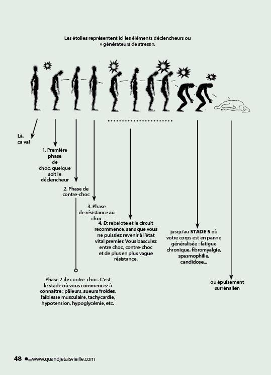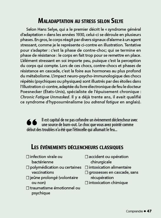 J’extrais ci-dessous quelques paragraphes de mon livre sur l’épuisement chronique : « Quand j’étais vieille » (https://quandjetaisvieille.com). La plupart des cas de ce qu’on appelle burn-out sont victimes d’une maladaptation aux divers stress modernes. Adaptez ce que j’y écris à ce que vous vivez aujourd’hui, toutes proportions gardées. Le texte est illustré en format image en annexe.