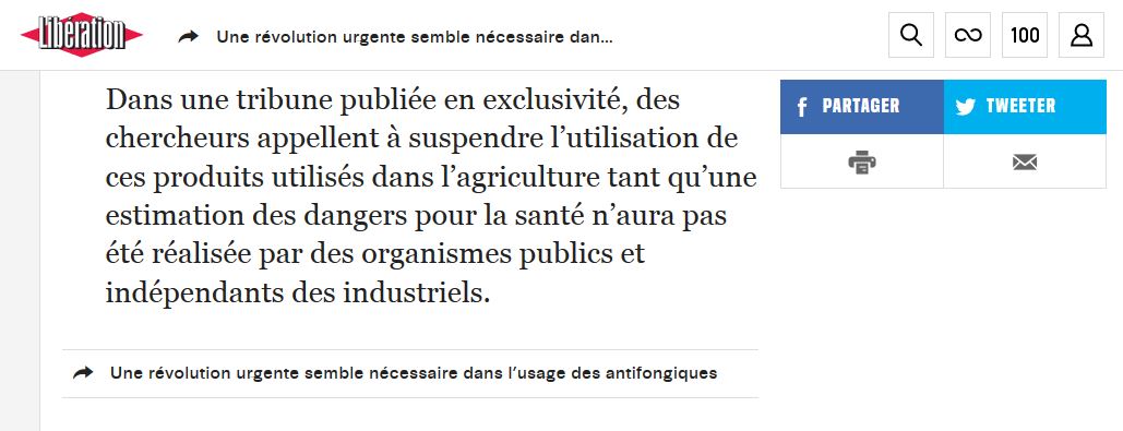 Je voudrais relayer sur ce blog une alerte scientifique aux fongicides, qui me semble drôlement d'actualité. Rendez-vous sur le site de l'émission de France Inter La tête au carré, qui a relaté cette alerte dans son chapitre "la une de la science" du 18 avril 2018. L'auditeur n'a pas le privilège d'une transcription (comme c'est le cas pour les émissions du dr Dupagne, dans la même émission - merci à lui!), format qui est privilégié par certains (qui a le temps d'écouter de longs échanges? alors qu'on lit si vite le contenu d'une conversation), ni même de résumé, ni le nom d'intervenant. Rien pour faciliter la recherche. J'imagine qu'ils s'épargnent ce travail sur le site parce qu'on trouverait ces infos sur leur page FB? Car ils s'y réfèrent sans arrêt: "rendez vous sur notre page facebook". Que font-ils donc des résistants à cette hégémonie? de ceux qui souhaitent rester droits et fiers, qui n'ont pas l'âme d'un gnou? Comment un non-geek pourrait-il relayer cette information cruciale sur son blog, facilement? On comprend que la majorité silencieuse ne se fie plus qu'à ce réseau, vu que les relais sont prémâchés.