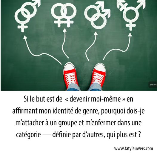 Argument 1: si le but est de "devenir moi-même" en affirmant mon identité de genre , pourquoi dois-je m'attacher à un groupe et m'enfermer dans une catégorie, définie par d'autres, qui plus est?