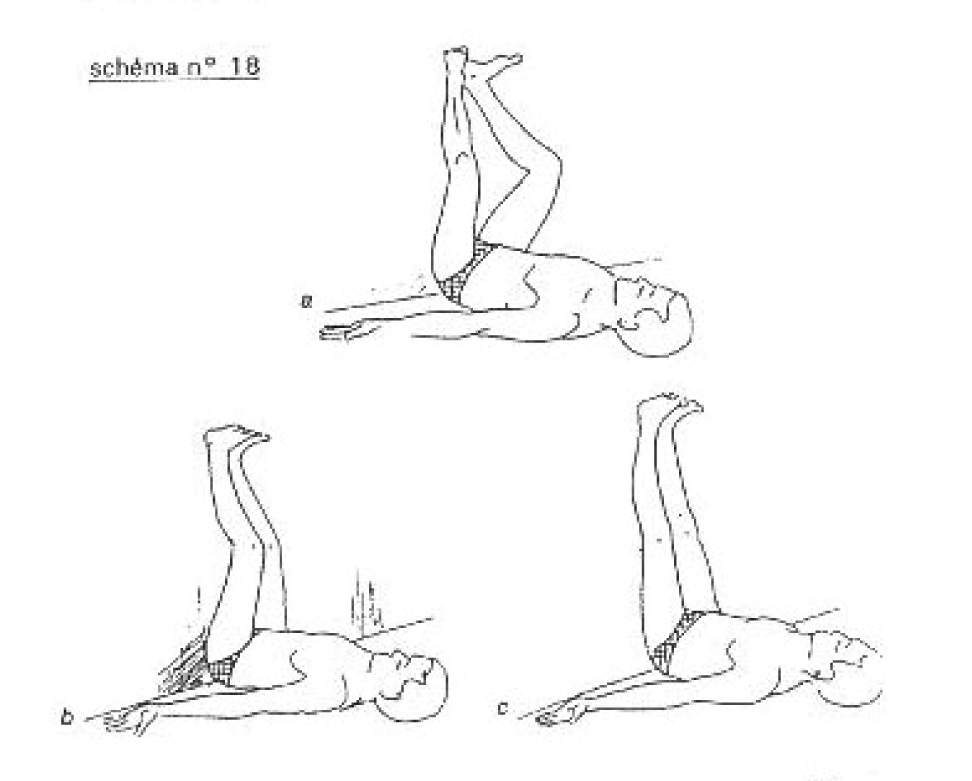 1. Se coucher sur le dos sur une natte, les jambes levées, les bras au sol, en L contre un mur, le cou rentré pour une colonne bien droite - les jambes tendues si possible, sinon "ce qu'on peut"