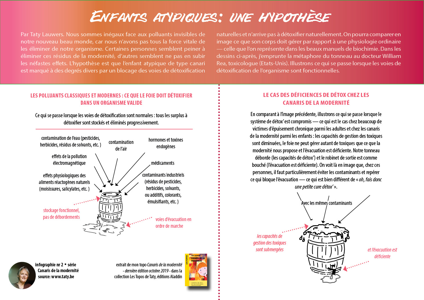 Par Taty Lauwers. Nous sommes inégaux face aux polluants invisibles de notre nouveau beau monde, car nous n’avons pas tous la force vitale de les éliminer de notre organisme. Certaines personnes semblent peiner à éliminer ces résidus de la modernité, d’autres semblent ne pas en subir les néfastes effets. L’hypothèse est que l’enfant atypique de type canari est marqué à des degrés divers par un blocage des voies de détoxification naturelles et n’arrive pas à détoxifier naturellement. On pourra comparer en image ce que son corps doit gérer par rapport à une physiologie ordinaire — celle que l’on représente dans les beaux manuels de biochimie. Dans les dessins ci-après, j’emprunte la métaphore du tonneau au docteur William Rea, toxicologue (Etats-Unis). Illustrons ce qui se passe lorsque les voies de détoxification de l’organisme sont fonctionnelles.