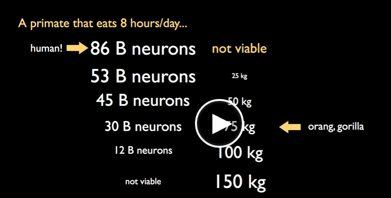 Quel est donc l'atout de l'être humain ? Qu'avons-nous donc qu'aucun autre animal n'a ? Ma réponse : nous avons la plus grande quantité de neurones dans le cortex cérébral, et je pense que c'est l'explication la plus simple de nos capacités cognitives exceptionnelles. Et que faisons-nous donc qu'aucun autre animal ne fait, et qui, à mon avis, a été fondamental pour nous permettre d'avoir autant de neurones dans le cortex ? En deux mots : nous cuisinons. Aucun autre animal que l'humain ne cuit sa nourriture. Et je crois que c'est ce qui nous a rendus humains.