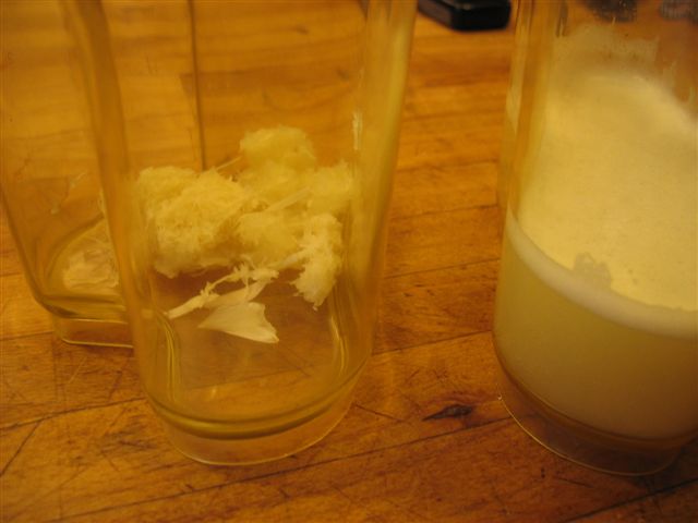 J'ai filtré des queues d'asperges crues au Jazz Pro, restants d'une dînette à midi où j'avais proposé des Asperges à la Flamande. J'ai transformé le tout en potage lié au parmesan (broyé au Jazz Max, juste pour voir; d'habitude je le râpe manuellement).