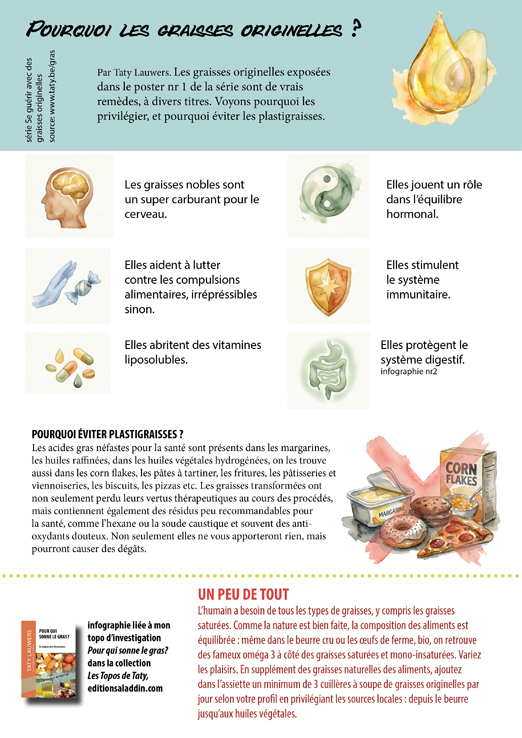 Je vous invite à télécharger une infographie qui résume pourquoi se fier aux graisses originelles, tel qu'elles sont définies dans mon topo "Nourritures vraies " et déclinées longuement dans "Pour qui sonne le gras?" (NB 2025: dernière édition en digital uniquement)