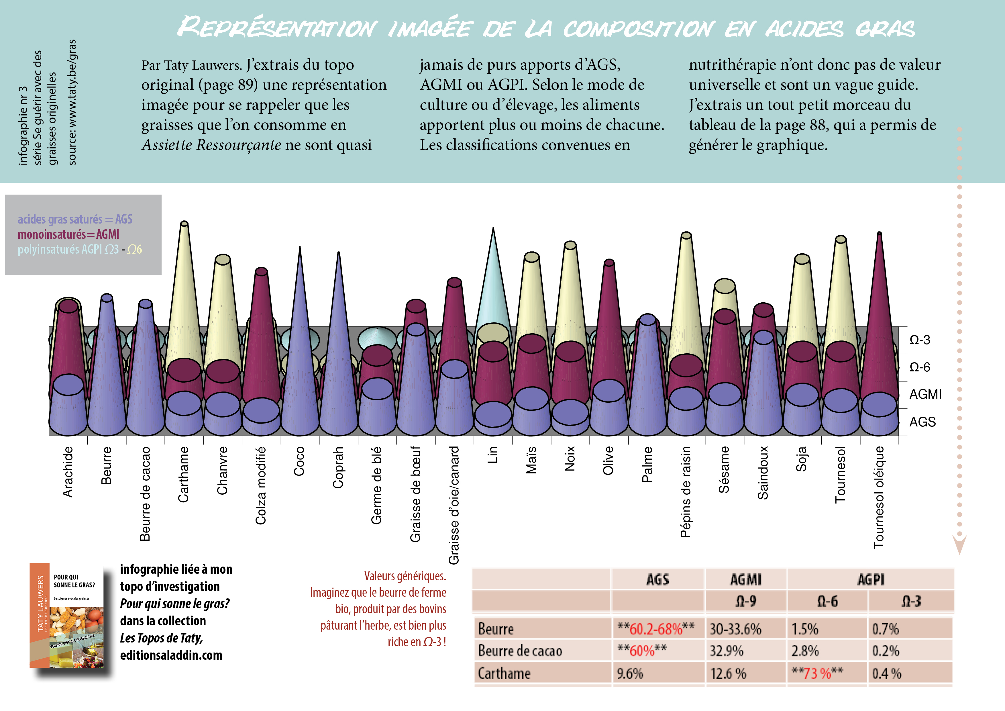 J’extrais du topo original (page 89) une représentation imagée pour se rappeler que les graisses que l’on consomme en Assiette Ressourçante ne sont quasi jamais de purs apports d’AGS, AGMI ou AGPI. Les deux pages mentionnées ici sont partagées en extraits sur le site officiel, sous le libellé "Catégories classiques".