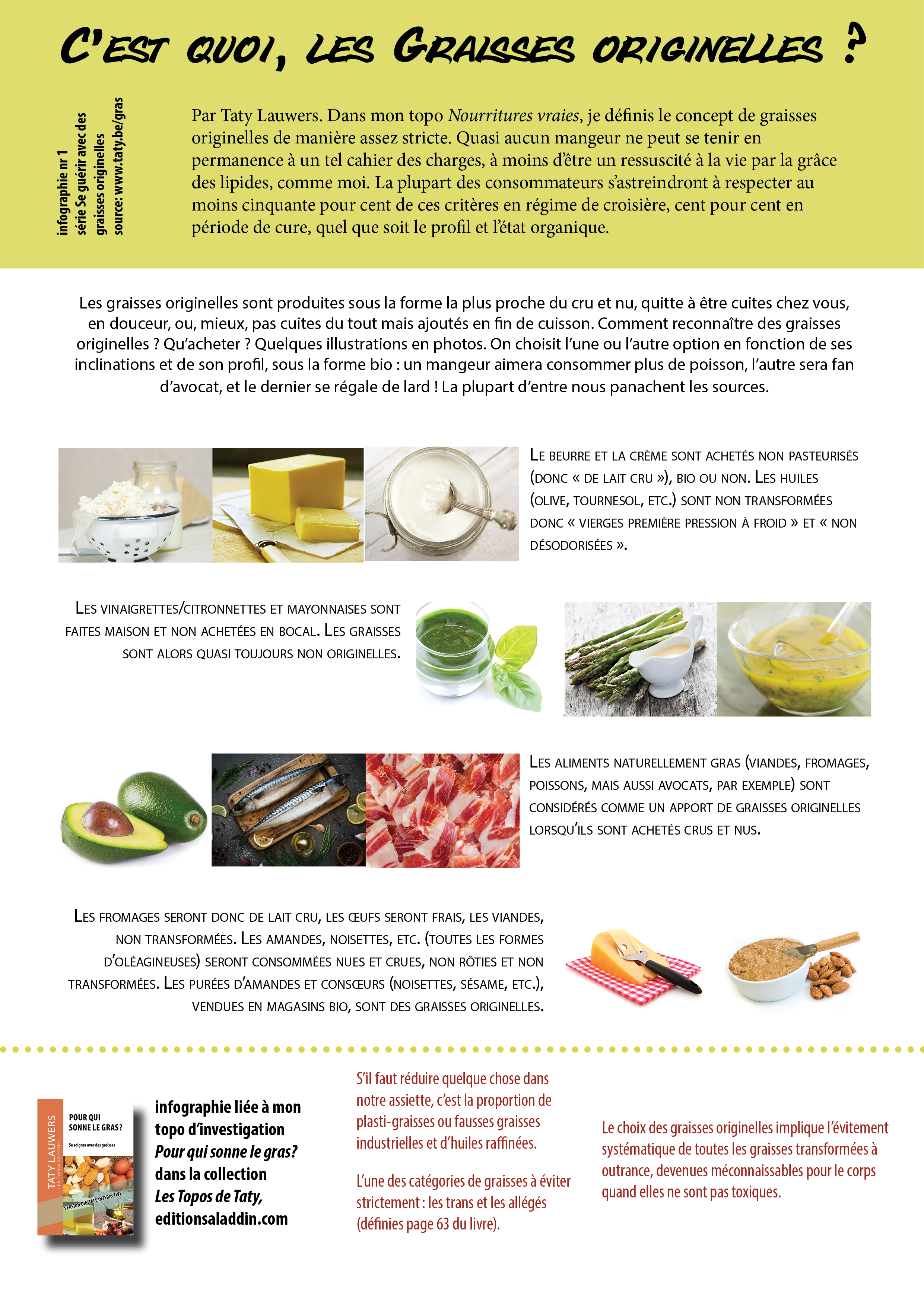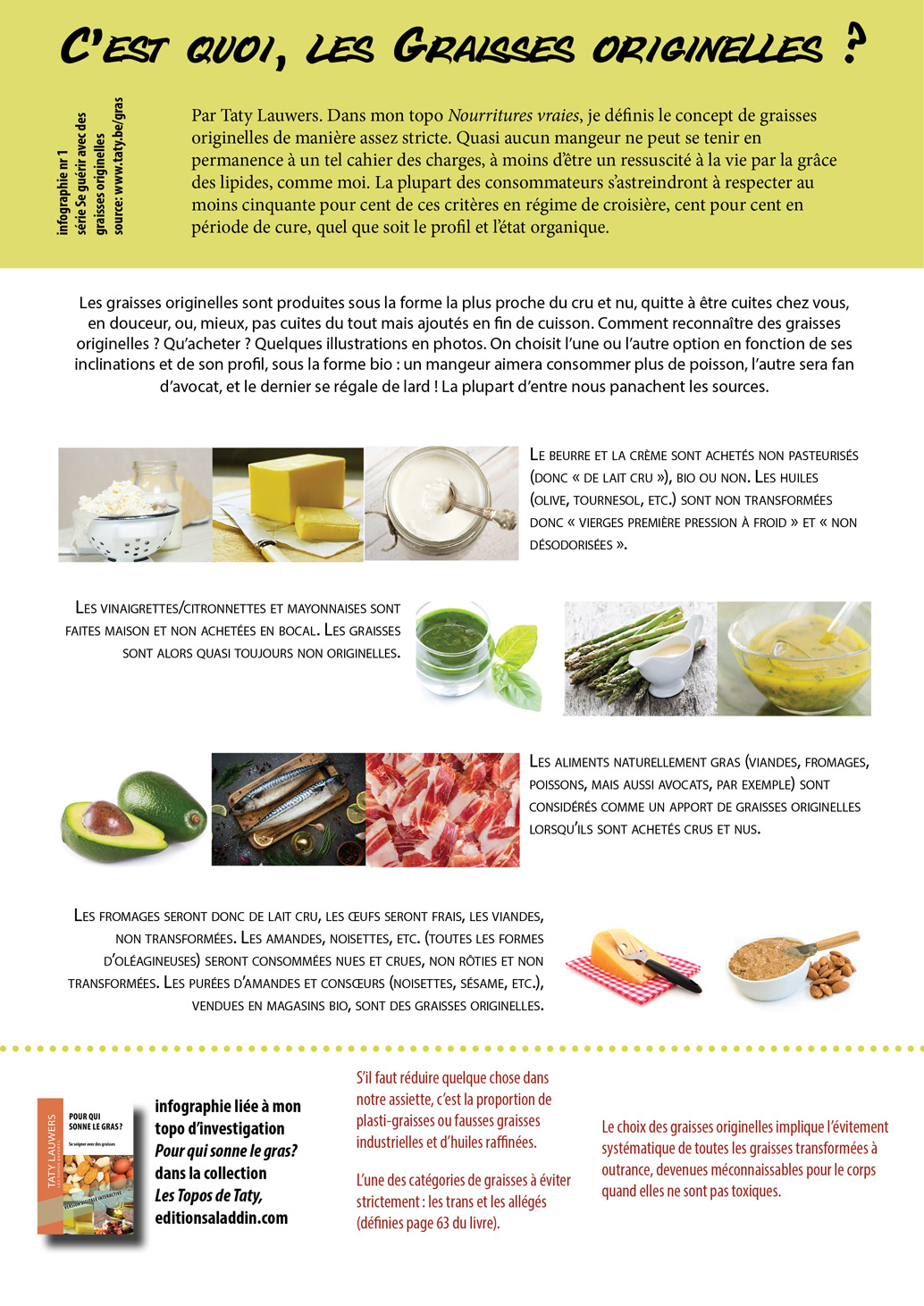 Je vous invite à télécharger une infographie qui résume le concept de graisses originelles, tel qu'il est défini dans mon topo "Nourritures vraies " et décliné longuement dans "Pour qui sonne le gras?" (NB 2025: dernière édition en digital uniquement)