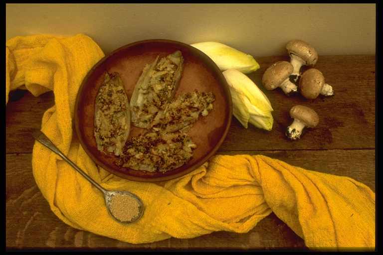 Ingrédients. 4 à 6 chicons (endives) restes de riz ou de quinoa cuit 150 g de champignons 2 échalotes 1 cuill. s. de persil plat 1 cuill. s. de ciboulette 50 g de parmesan Cuisson : 10 min (vapeur) et 20 min (four)