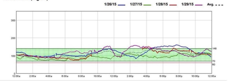Voir en images le résultat sur la glycémie d'un DID. Les valeurs sont celles de l'épouse de Marty Kendall, DID désormais normalisée avec le plan Bernstein après avoir testé la cétogénique en version populaire, càd haute en graisses et s'être rendu compte que cette diète la rendait insulino-résistante... (tous les chemins mènent à Rome) :