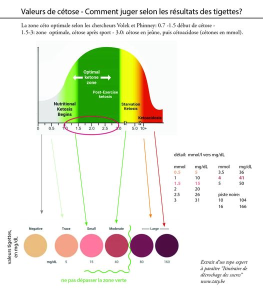 Dans ma prochaine cure à paraître "Retour à soi" - que j'affirme aussi, si pas plus efficace que la diète cétogénique sur le bien-être inflammatoire - on fait TOUT pour ne pas entrer en cétose. J'ai mes raisons, elles seront dans le bouquin. Pour ceux qui pratiquent la cétogénique et qui aiment le suivi en tigettes, testeur respiratoire ou sanguin (souvent des sportifs), un outil utile: la zone de cétose optimale telle que testée par les chercheurs Volek et Phinney, spécialistes de cétogène et de sport intensif. Pour un débutant, comment réconcilier le graphique exprimé en mmol et le résultat des tigettes exprimé en mg/dL?