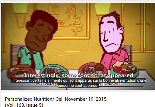 J'invite les curieux, amateurs un peu trop enthousiastes de listes d'aliments figées (d'index glycémique), à visionner une petite vidéo distrayante et dont le contenu est prodigieusement intéressant: une équipe israelienne a publié sa recherche sur les variations glycémiques individuelles et a intelligemment mis le résumé en vidéo dessinée. Le pitch: les aliments provoquant une glycémie élevée ne sont pas identiques chez tous les mangeurs. Chez l'un des testés (le veinard), les bananes provoquaient de très hauts taux alors que des crèmes glacées et des biscuits ne modifiaient pas outre mesure ses réactions glycémiques.