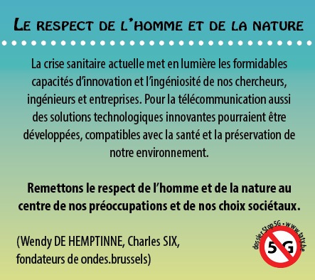 Demandons une reconsidération complète de l’utilisation des technologies sans fil et de l’utilisation de ce bien commun que constitue le spectre radioélectrique. La priorité doit être donnée à la santé humaine et à la préservation d’un environnement sain pour tous les êtres vivants.