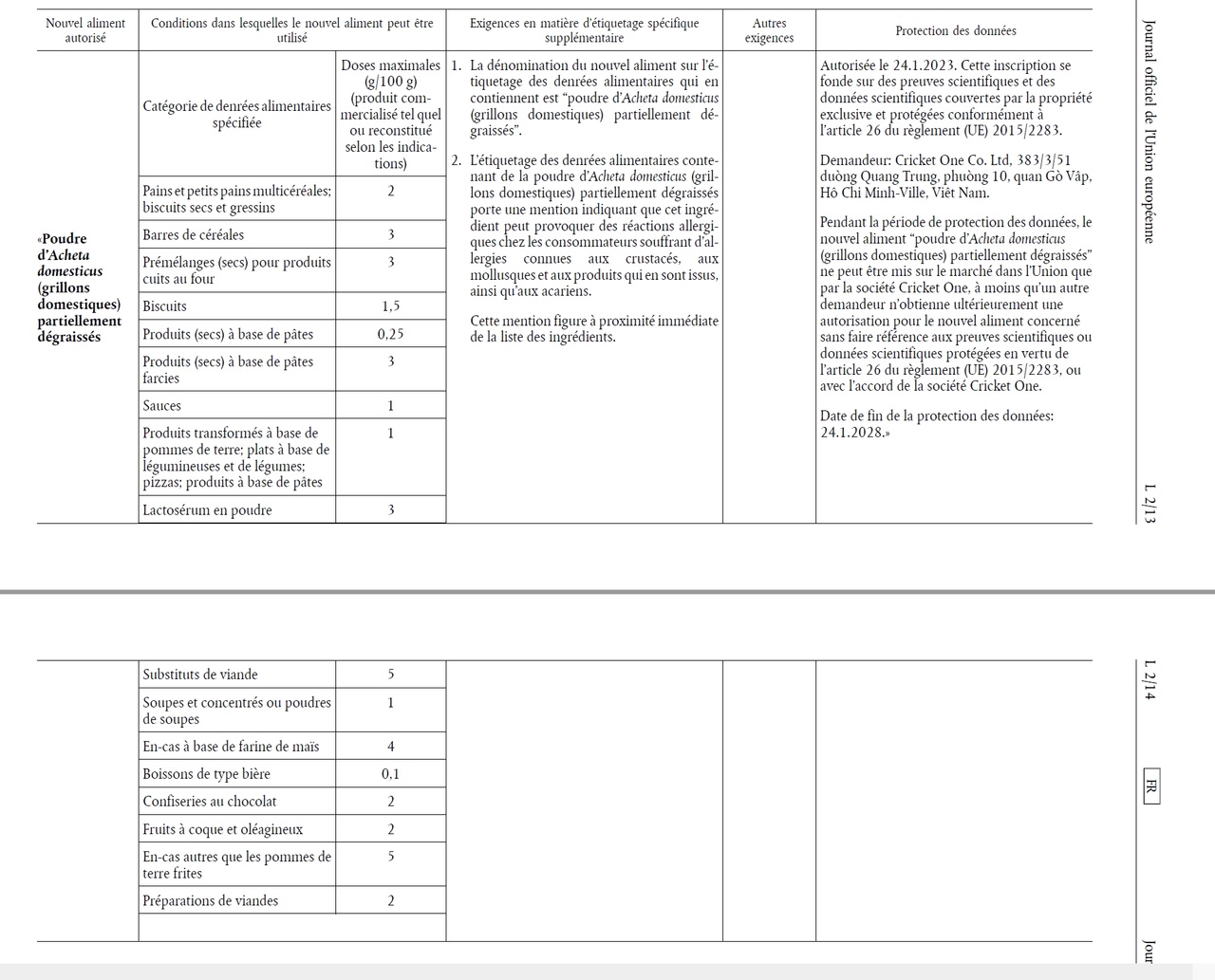 "L'UE autorise, pour la nouvelle année 2023, l'ajout d'insectes (grillons domestiques) dans les produits de boulangerie, les pâtes et autres produits finis partiels "destinés à la population générale". L'étiquetage n'est obligatoire que si le produit contient de la poudre d'"Acheta domesticus". L'autorisation débute le 24 janvier 2023.