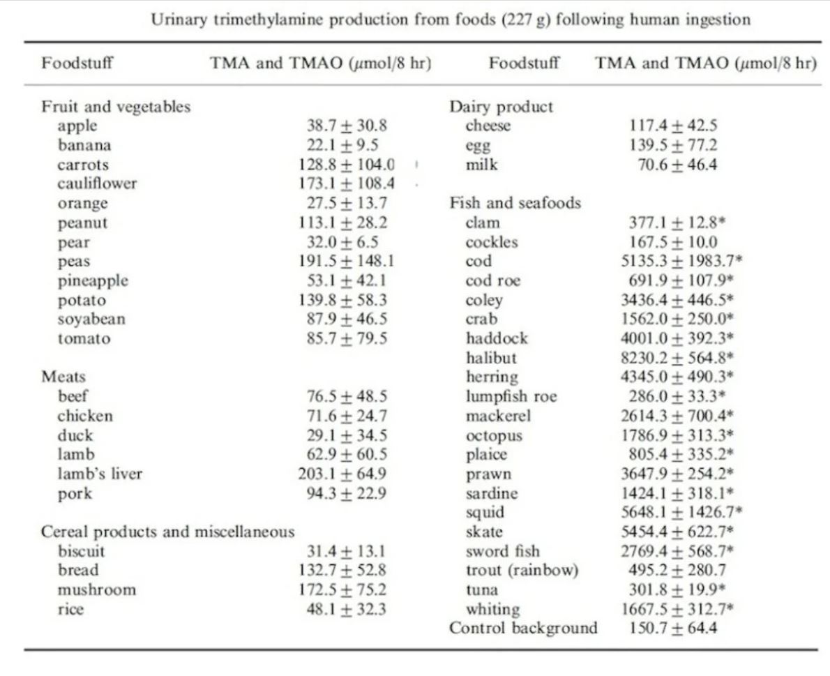 Alors comment se fait-il que ça nous tue si nous mangeons du bœuf, mais que ça ne nous tue pas si nous mangeons du poisson ? D'autant plus que le poisson génère beaucoup plus de TMAO que la viande rouge. Un ordre de grandeur supérieur, en fait. Jetez un coup d'œil au tableau ci-dessous, tiré d'un tableau figurant dans les références d'un autre article datant d'il y a près de dix ans et traitant de l'effet meurtrier de la TMAO.