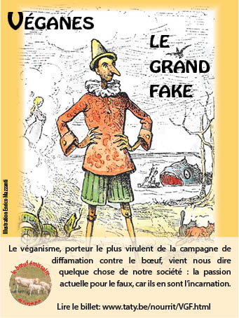 Et c'est alors que les véganes se réveilleront, gros-jean comme devant, car leur "cause" n'aura pas avancé pour autant, ils auront ouvert les portes à l'industrie qui aura encore plus pris pied dans nos vies, ils auront obtenu l'abolition ou quasi de l'élevage que les intérêts financiers souhaitent, ils seront dans un état de décapilotade intérieur avancé et nous, sur le terrain, nutritionnistes de bon sens, ne pourront plus les requinquer avec les nourritures vraies qui sont nos remèdes. Ne pensons même pas à la santé de leurs enfants, qu'ils auront entraînés dans cette triste aventure, santé qui sera endommagée pour longtemps. Disons pour enfoncer le clou qu'ils auront été de fake bons parents.