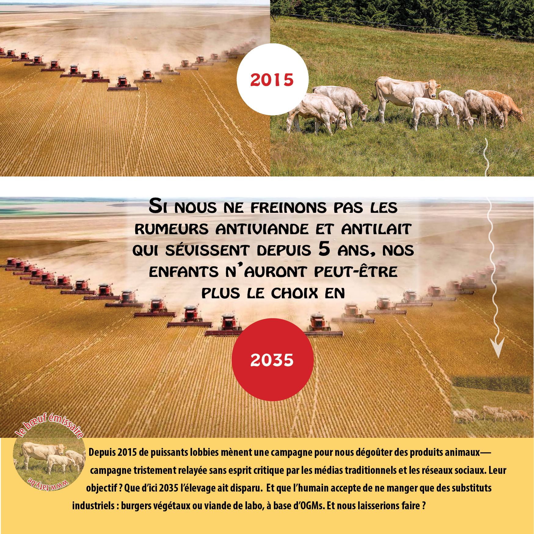 Depuis 2015 de puissants lobbies mènent une campagne pour nous dégoûter des produits animaux— campagne tristement relayée par les médias traditionnels et les réseaux sociaux. Leur objectif ? Que d’ici 2035 l’élevage ait disparu. Et que l’humain accepte de ne manger que des substituts industriels : burgers végétaux ou viande de labo, à base d’OGMs. Et nous laisserions faire ?