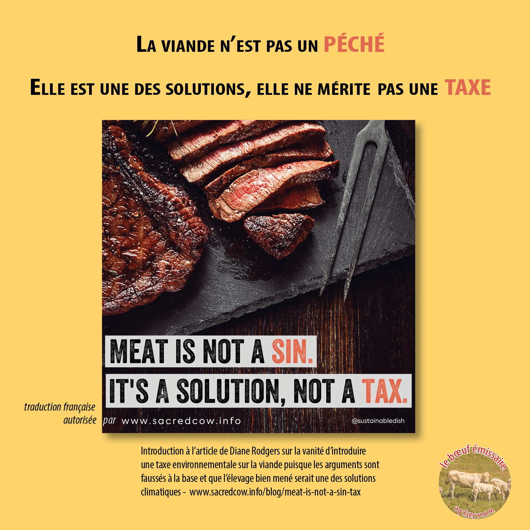Je continue sur ma lancée: réfléchissons un peu les slogans simplistes qui nous sont balancés tous les jours sur les réseaux sociaux. En anglais, une taxe environnementale se dit "taxe de péché". Certains pays européens proposent de taxer la viande, mais elle n’est pas un péché! Elle ne mérite pas une taxe, vu que les arguments sont faussés à la base. Les animaux élevés en pâture raisonnée seraient même partie de la solution pour protéger la planète. Voilà ce qu'explique l’article de Diane Rodgers sur la vanité d’introduire une taxe environnementale: Meat is not a sin tax. Traduction ici, sous peu.