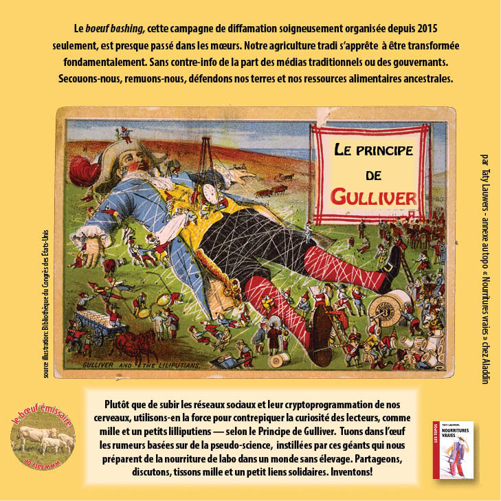 Plutôt que de subir les réseaux sociaux et leur cryptoprogrammation de nos cerveaux, utilisons-en la force pour contrepiquer la curiosité des lecteurs, comme mille et un petits lilliputiens — selon le Principe de Gulliver. Tuons dans l’œuf les rumeurs basées sur de la pseudo-science, instillées par ces géants qui nous préparent de la nourriture de labo dans un monde sans élevage.
