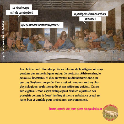 Les choix en nutrition des profanes relevant de la religion, ne nous perdons pas en polémiques autour de postulats. Athée sereine, je suis aussi libertaire : ni dieu ni maître, ni diktat nutritionnel ni gourou. Seul mon corps décide ce qui est bon pour moi au plan physiologique, seuls mes goûts et ma satiété me guident. Cerise sur le gâteau : mon esprit critique peut évaluer la justesse des postulats comme le boeuf-bashing et mettre en balance ce qui est juste, bon et durable pour moi et mon environnement.