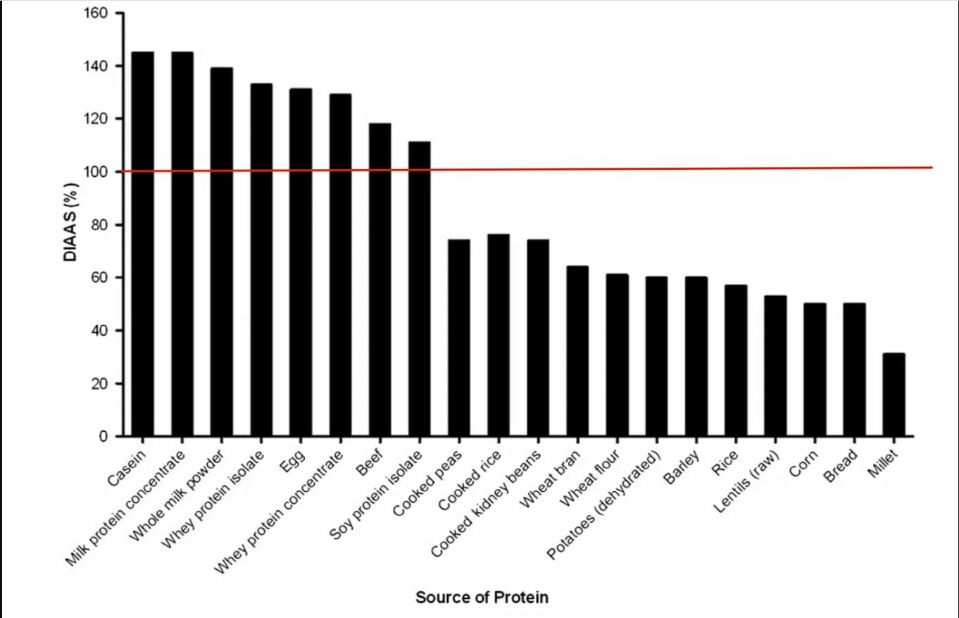 La ligne rouge que j'ai tracée indique le point de rupture entre les protéines de haute qualité, qui fournissent tous les acides aminés essentiels en quantités correctes, et les protéines de qualité médiocre.