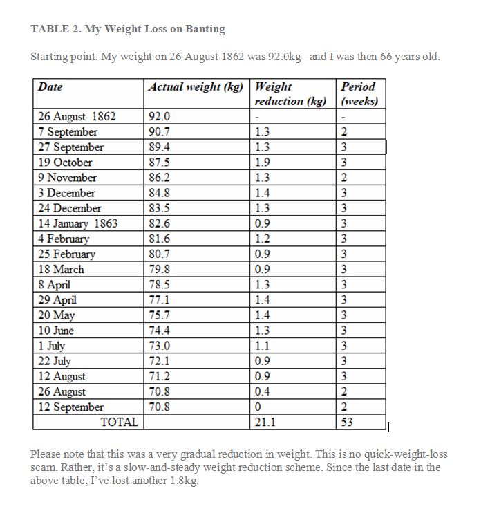 Les régimes LCHF ne doivent pas nécessairement être surprotéinés, comme le croient certains (croyance ravivée par la mode actuelle du régime carnivore aux States). Démonstration à partir du cas de Banting. Il avait perdu une vingtaine de kilos sur un an, passant de 90kg à 70kg (voir ci-dessous en tableau, selon son livre transmis en anglais "moderne" sur https://thenoakesfoundation.org/infographics/banting-letter-on-corpulence-in-todays-english) . Poids qu'il avait stabilisé par la tenue permanente du régime. Refrain connu: si vous choisissez cette voie, il faudra y rester car le retour à "manger de tout, autant que voulu" est une promesse de rebond.