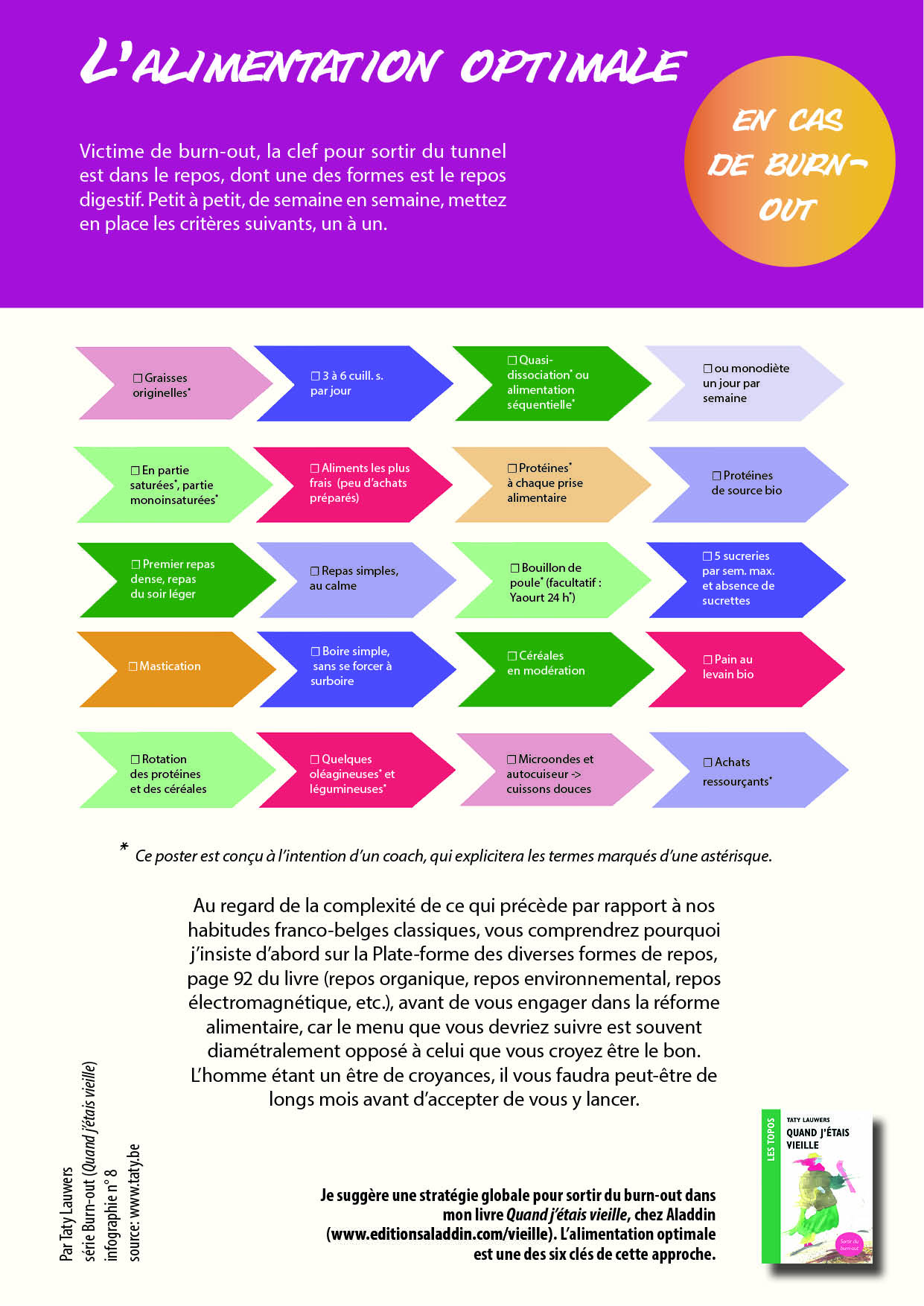 <a href="https://www.taty.be/vieille/criteres_alim.html"><img src="https://www.taty.be/vieille/qv8criteres_alim_tatybeMED.jpg" title ="L'alimentation optimale en cas de burn-out - infographie nr 8 , par Taty Lauwers" alt="L'alimentation optimale en cas de burn-out - infographie nr 8 , par Taty Lauwers" border="0" style="max-width:100%; min-width:300px; margin: 0 auto 20px auto; display:block;"> <p style="max-width:800px; min-width:300px; margin:0 auto; text-align:center;"> L'alimentation optimale en cas de burn-out, infographie nr 8</a> (sur le site www.taty.be)</p>