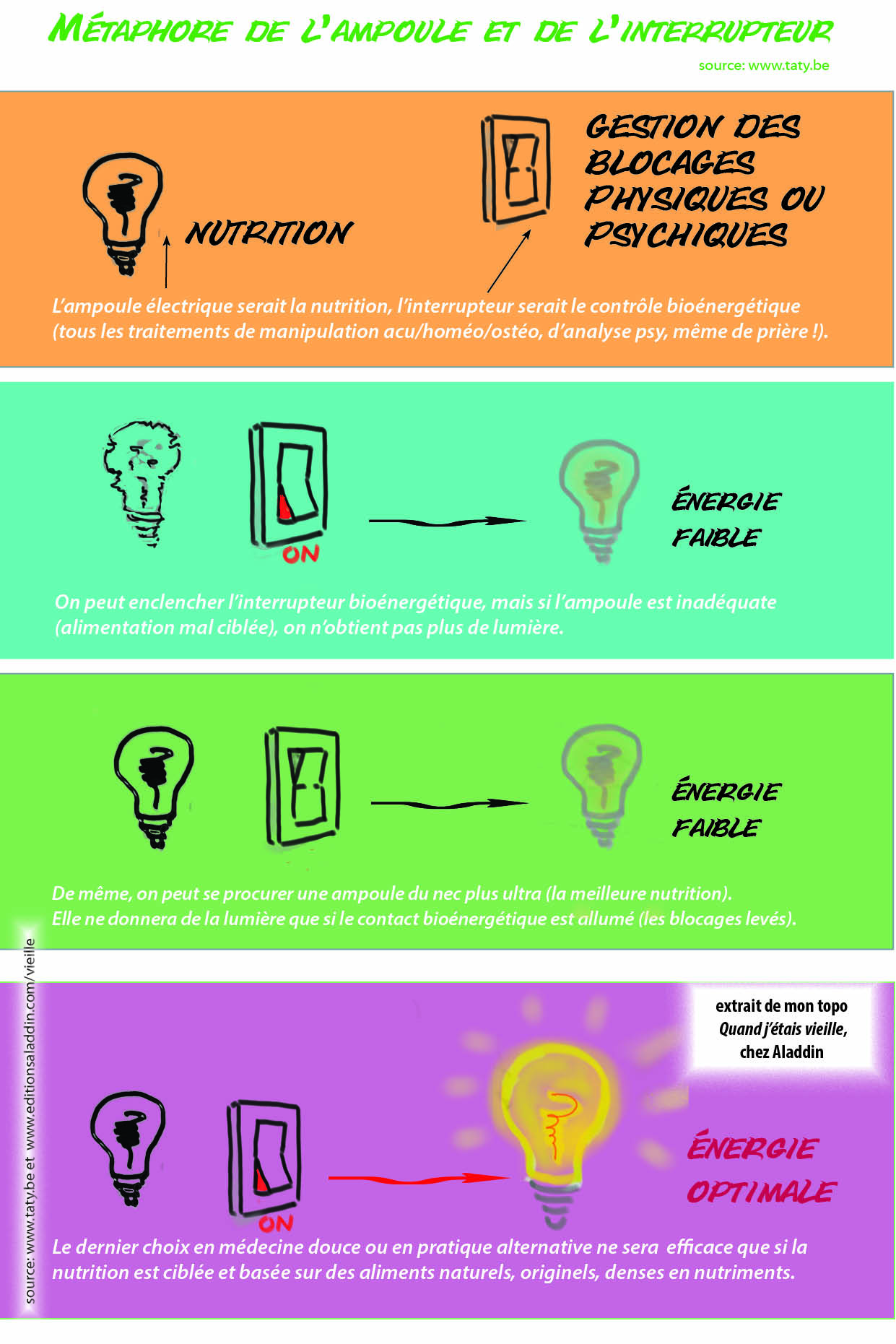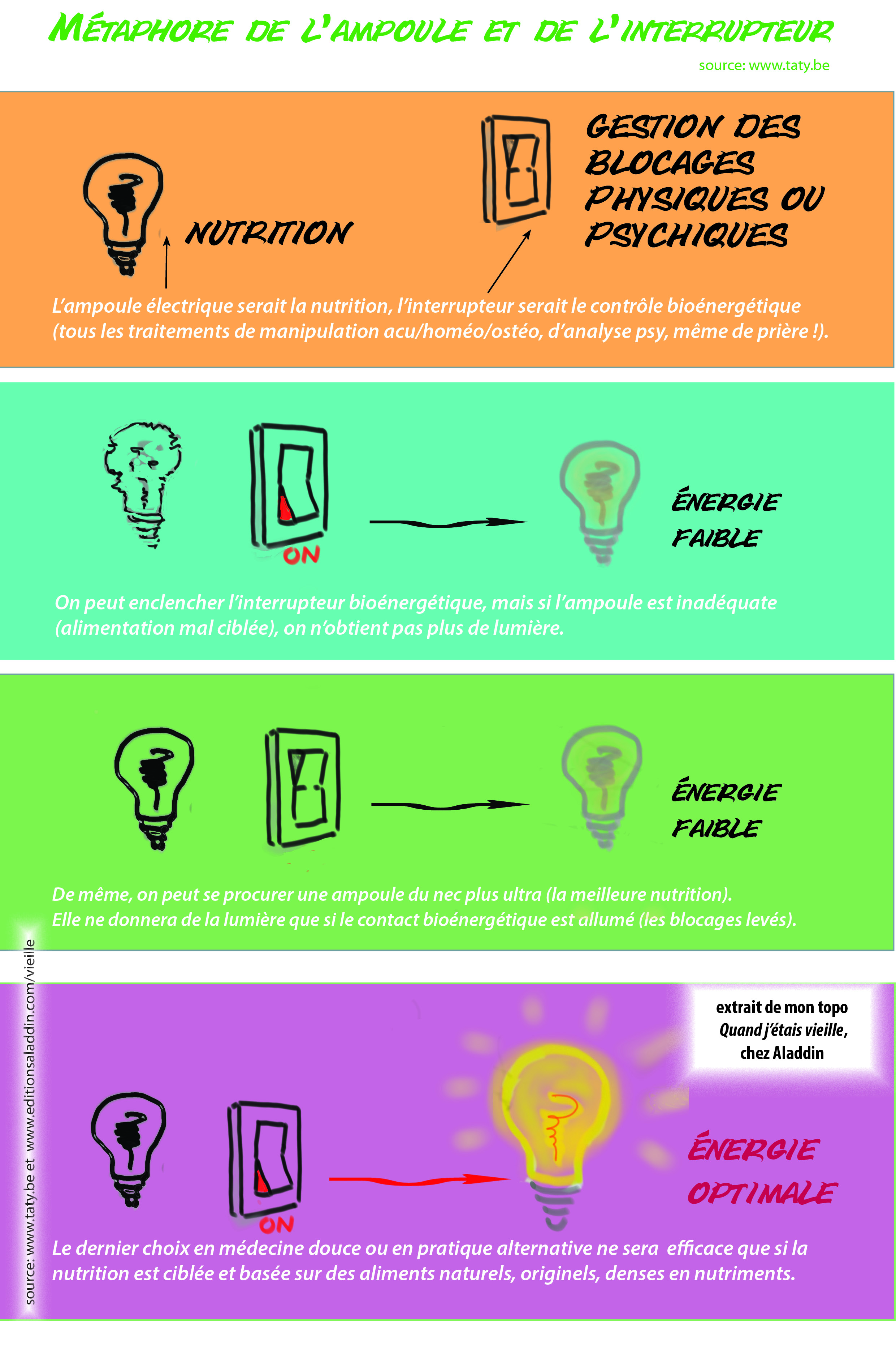 "Considérons la métaphore de l'ampoule, de l'interrupteur et de la lumière. L'ampoule électrique serait la nutrition, l'interrupteur serait le contrôle bioénergétique (tous les traitements de manipulation acu/homéo/ostéo, d'analyse psy, même de prière !). On peut se procurer une ampoule du nec plus ultra (la meilleure nutrition), mais elle ne donnera de la lumière que si le contact bioénergétique est allumé (les blocages levés). De même, on peut enclencher l'interrupteur bioénergétique, mais si l'ampoule est inadéquate (si vous vous nourrissez de verre pilé, euh pardon : de coca/burger/frites ou d'aliments de dépannage comme les surgelés passés au microondes...), on n'obtient pas de lumière. Votre dernier traitement en médecine douce ne sera vraiment efficace que si la nutrition est basée sur des aliments naturels, originels, denses en nutriments. "