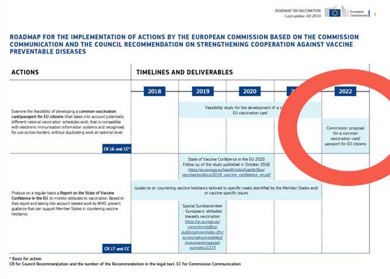 J’extrais l’image d’un document accessible à tous en pdf via https://ec.europa.eu/health/sites/health/files/vaccination/docs/2019-2022_roadmap_en.pdf : c’est en 2022 qu’est prévu le passeport européen de vaccination.