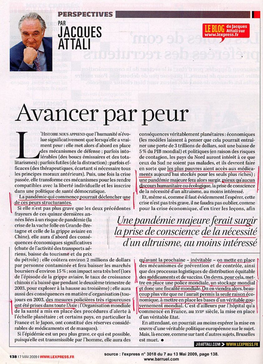 26.7.2020 La gouvernance mondiale qui obsède Jacques Attali et consorts justifiera tous les moyens, dont la culture de la peur et la surutilisation du numérique. On peut tout reprocher à Attali mais au moins il annonçait déjà la couleur en 2009, au coeur de la crise H1N1.