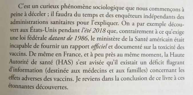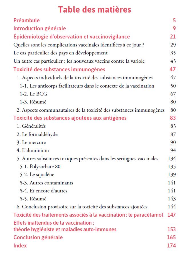 L’agence de santé ayant mis le produit sur le marché n’a également aucun intérêt à mettre en cause un produit manifestement défectueux qui aurait été donc mal évaluéBien évidemment le livre rentre dans la technique vaccinale en abordant aussi bien les facteurs de toxicité propres à chaque produit ou constituant comme à la toxicité « communautaire » par phénomènes de déplacement / remplacement. La problématique des anti-corps facilitateurs est également longuement abordée tout comme les polémiques sur les adjuvants.