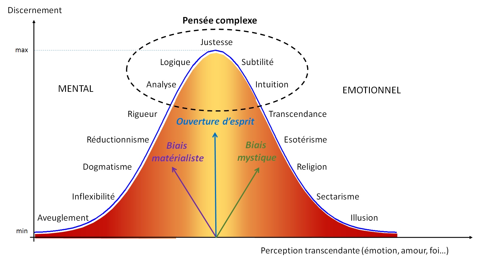 L’image ci-jointe reprend l'effet « du biais matérialiste caractérisé par le fait que ce type de pensée se refuse à toute possibilité de perception transcendante, ne désirant voir dans le réel que ce qui est analysable par le mental». Ne l'extrayez pas du contexte, lisez-la en lien avec l'article de Guillemant. Je précise après avoir lu des commentaires lecteurs: si on prend l'image comme un guide, ce n'est pas clair; si on la prend pour ce qu'elle est, càd un audit du réel, elle est claire. Je vois le dégradé du milieu et du haut, qui est significatif. Le mental et l'émotionnel s'interpénétrent en lumière. Je m'y retrouve dans la mesure où même dans mes dossiers je cumule LAJSI (logique, analyse, combinées en justesse avec subtilité et intuition).