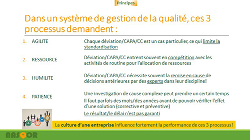 NB TL: Déviation/CAPA/CC sont des termes techniques de l'industrie pour «gestion des événements Inattendus», «corrective action/preventive action» et « change control» (2 processus qualité fortement encadrés).