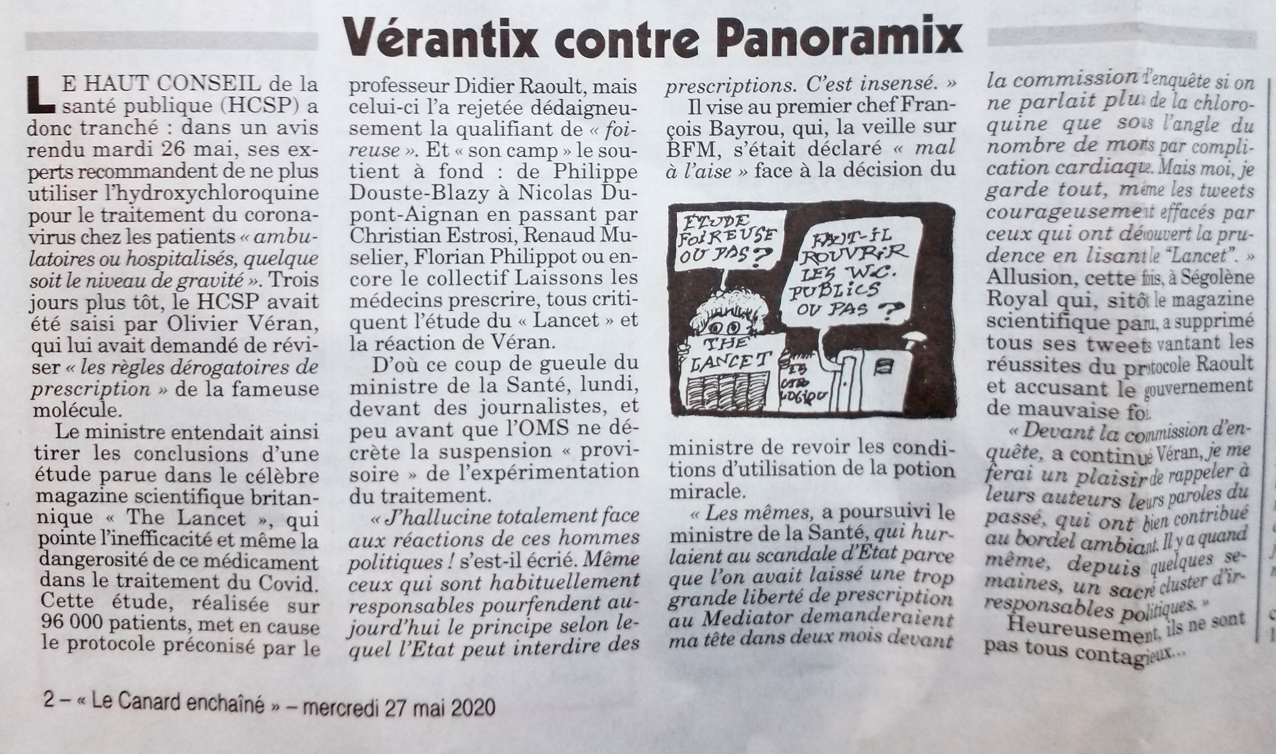 Une étude sort dans le Lancet, dénonçant les grands dangers d’un médicament utilisé sur le terrain par quantité de médecins avec grand succès contre le covid. Il ne faut pas quelques jours pour que des spécialistes réagissent en qualifiant l’étude ahurissante de médiocrité. Il faut encore 2 jours pour que l’on comprenne que l’auteur a réalisé un montage artificiel de données; et que le Lancet, anciennement vénéré, a accepté ce torchon.