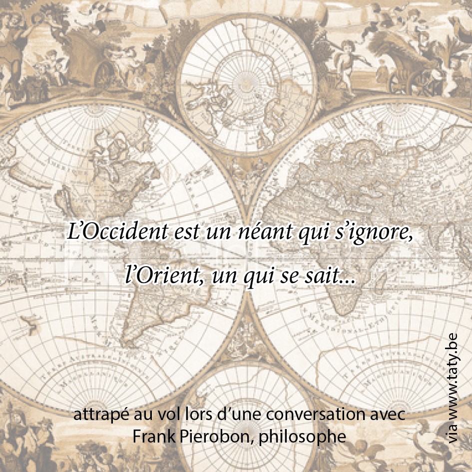Sa réponse m’enchante par sa légèreté fluide et limpide, mais profonde comme un océan : « L’Occident est un néant qui s’ignore, l’Orient, un qui se sait... ».