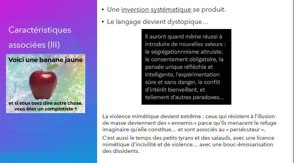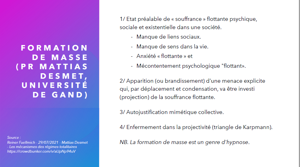 Le 6/11/2021, Jean-Dominique Michel interprète les hypothèses de Mattias Desmet dans sa dernière intervention auprès du CSI. Je n'ai pas encore écouté, j'ai téléchargé son pdf. J'en ai repris quelques diapos ci-dessus.