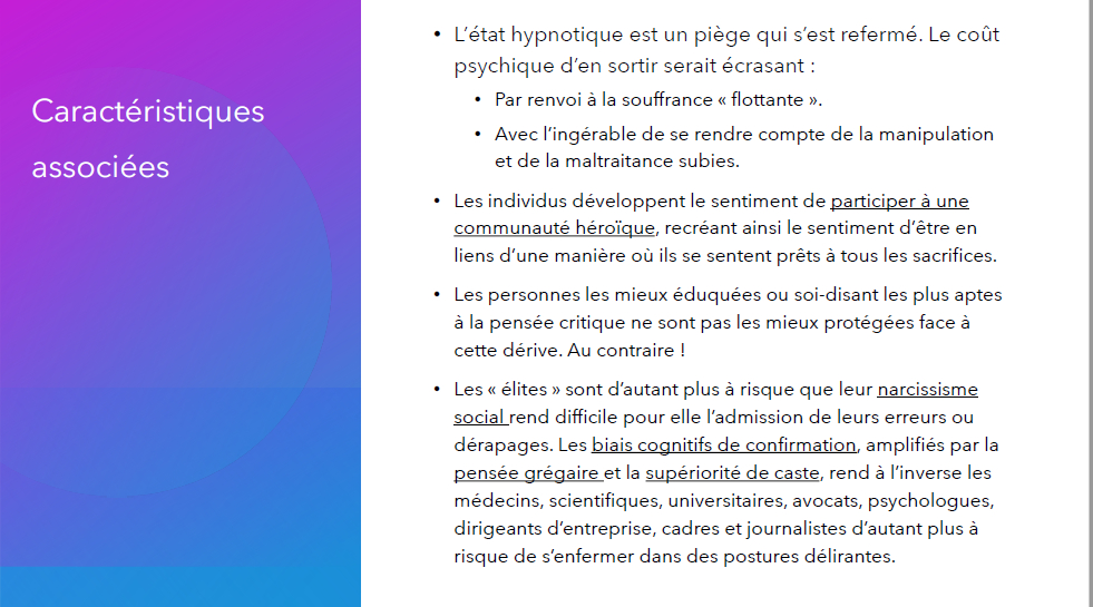 Depuis environ juin 2020, j'explore l'hallucination collective. Je propose depuis lors aux lecteurs de ne pas débattre, ni polémiquer, avec certains covidistes, car ils sont littéralement sous hypnose. Phénomène qu'avait observé le dr Louis Fouché dès sa première intervention vidéo (anesthétiste, il connaît la technique). La communication autour de la crise corona a apporté un objet de transfert à l'angoisse sourde qui étreignait tant de nos camarades.