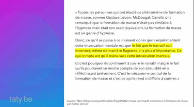 Une massification de l’opinion n'est pas proche de, elle est exactement équivalente à l’hypnose.