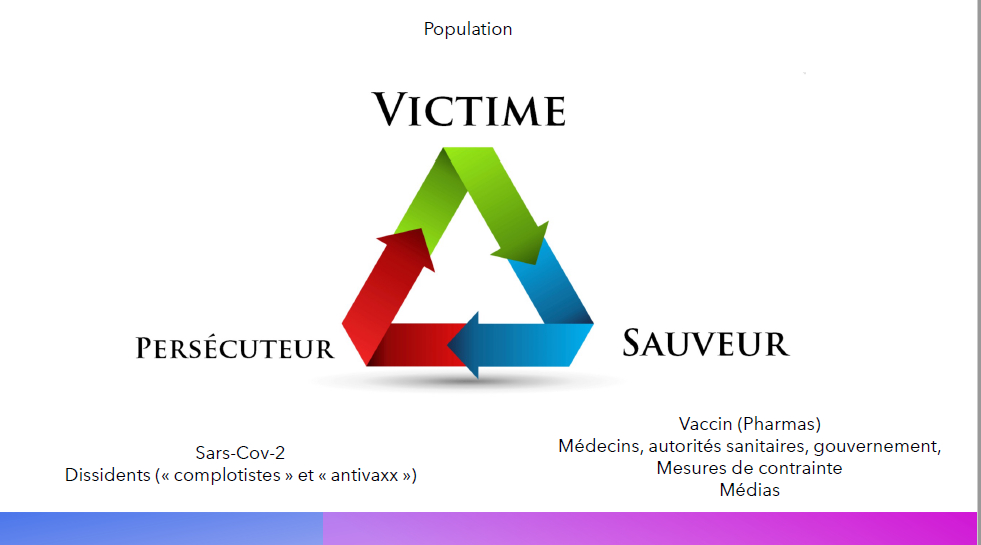 La captation de cet investissement pulsionnel par le narratif officiel devient un jeu d’enfant : dans une configuration élémentaire « à la » triangle de Karpmann (que Desmet ne mentionne pas), les gens s’éprouvent victimes ou à risque de l’être avec un bourreau identifié (le redoutable virus, auquel se retrouvent agglutinés ceux qui contestent le narratif officiel -complotistes et antivaxx selon les étiquettes de circonstance- désignés eux aussi comme des « dangers publics » ) et un sauveur qui l’est tout autant (les autorités protectrices et le « vaccin » salvateur).