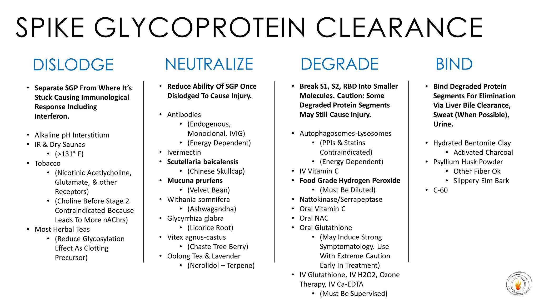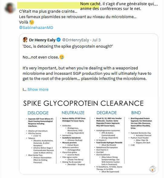 "Doc, est-ce que la désintoxication de la glycoprotéine spike (SGP) est suffisante ? Non... pas du tout. C'est très important, mais (...) , vous devrez en fin de compte vous attaquer à la racine du problème... les plasmides infectant le microbiome. Je continue à voir des gens faire un peu de ceci et un peu de cela, mais cela ne marche pas. Il s'agit d'une infection génétique qui doit être traitée en tant que telle. Il est essentiel que les personnes qui réduisent leur charge en SGP choisissent au moins une des quatre catégories afin d'éliminer la SGP. Les IgIV et l'ivermectine figurent dans la catégorie des neutralisants. Cela aide beaucoup mais ne s'attaque pas à la cause première, à savoir un microbiome chargé en arme biologique. Pour cela, il y a d'autres choses à faire, notamment utiliser des composés qui guérissent les plasmides comme la quercétine et des antibiotiques naturels ."