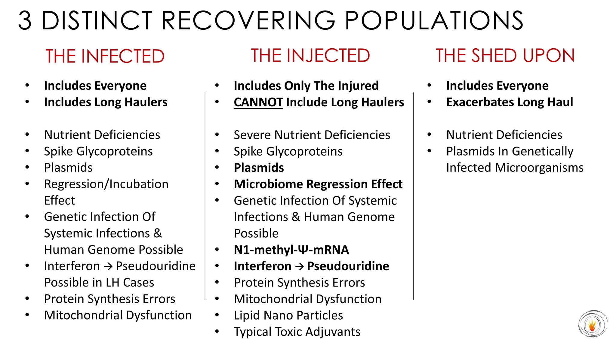 Mon NB. On pourrait ajouter aux "sheddés" une partie supplémentaire, provenant de la colonne du centre. En effet, dans les études sur animaux après "exposition passive au vaccin ARNm", on a bien observé des modifications génétiques. Les sheddés ont la chance de ne pas transporter les adjuvants, oh quelle joie.
