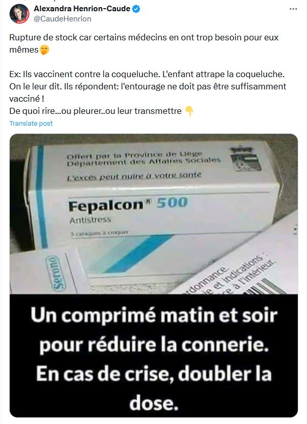 17.9.24 Copie d'un tweet d'Alexandra Henrion-Caude à propos du vax coqueluche, qui, à la rentrée scolaire 2024, fait tourner bien des têtes.