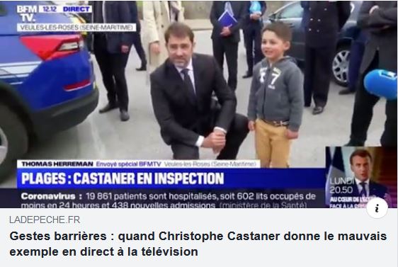 Combien de fois devrai-je répéter: il ne faut pas porter de masque, il ne faut de distanciation. Y a qu’à regarder le patron... Il n'y croit pas lui-même. Castaner n'est ici qu'un exemple, on en a plein parmi nos élus. On voit aussi en vidéo le tout puissant Fauci américain, grand terroriste pro masque https://www.facebook.com/gary.homberg.73/videos/746541886094909/UzpfSTEwMDAwMTc4NTc1MDMxNjozMDk1MDk0MjU3MjI2NzM2/: "Quand la caméra est éteinte, le virus disparaît. Le Dr. Fauci du CDC retire son masque des qu’il n’est plus en direct". Ce qu'on a vu aussi aux conférences de presse, dont j'ai relayé les vidéos (journalistes aussi bien que délégués officiels); ce qu'on verrait si on envoyait tous des minidrones espionner nos élus... Personne parmi les décideurs n'y croit, de toute évidence. On aurait dû se douter que, puisque masque il y a, nous assistons à une pièce de théâtre où le faux est mis en scène. Les toutes premières tragédies étaient chantées, les acteurs derrière des masques.