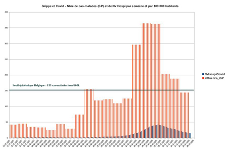 2. Un graphique (voir dernier post) concernant les « nouvelles hospitalisations attribuées covid » à comparer avec le nombre de « nouvelles grippes » déclarées par le système sentinelle, basée sur les médecins généralistes. L’une et l’autre sont exprimées par semaine et par 100 000 habitants. Cela place la réalité des « nouvelles hospitalisations attribuées covid », dans un système ‘normalisé’ (ici par 100 000 habitants), ce qui permet des comparaisons.